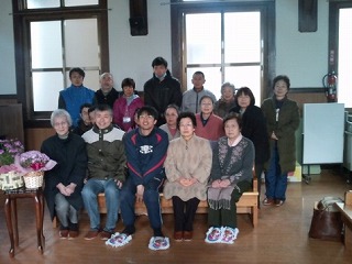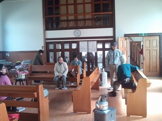 3月27日(日)は、地震から3回目の日曜日を迎えました。教会員が次々と集まりお互いの無事を喜びながら礼拝を捧げました。何度も拭きあげられた椅子を会堂の後ろの方にロの字に合わせ、讃美歌を歌い和基牧師の短いメッセージを聞きました。教会員一人ひとりが現状を話し、ボランティアの方達もみんな近隣の店舗のヘドロの片づけを中断して教会に戻って礼拝に出席されました。被災した教会員・地域の方・ボランティアそれぞれの思いが語られた礼拝となりました。どんなに絶望深い事かと思われるこの地で、皆で神様に救いと慰めを祈り、神様への感謝の言葉を聞きました。深い悲しみの中になお、神様の真実はいっそう深く臨んできて、悲しみの中にある人たちの間にも私の内にも生きる力と望みを与えて立たせてくださることを感じました。