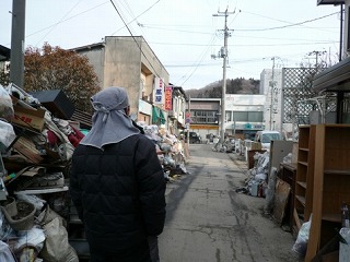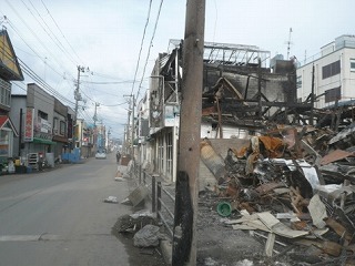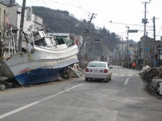 教会のある宮古市大通りと面した末広町商店街・近隣の家でも昼間は、少しずつ片づけが進み、瓦礫の撤去が行われて行きました。商店街では、瓦礫を撤去し、津波によってシャッターが壊された店舗の中から、使えそうなものは水でじゃぶじゃぶ洗って、中身の大丈夫だった醤油やビール・衣類なども物資にも困っている近隣の住民に販売されるなど、店が一軒また一軒と再開され、町を復興していこうとする地域の方達の力にこちらが力づけられました。しかし、未だに町のあちこちに漁船が突っ込んだままの状態でもあります。